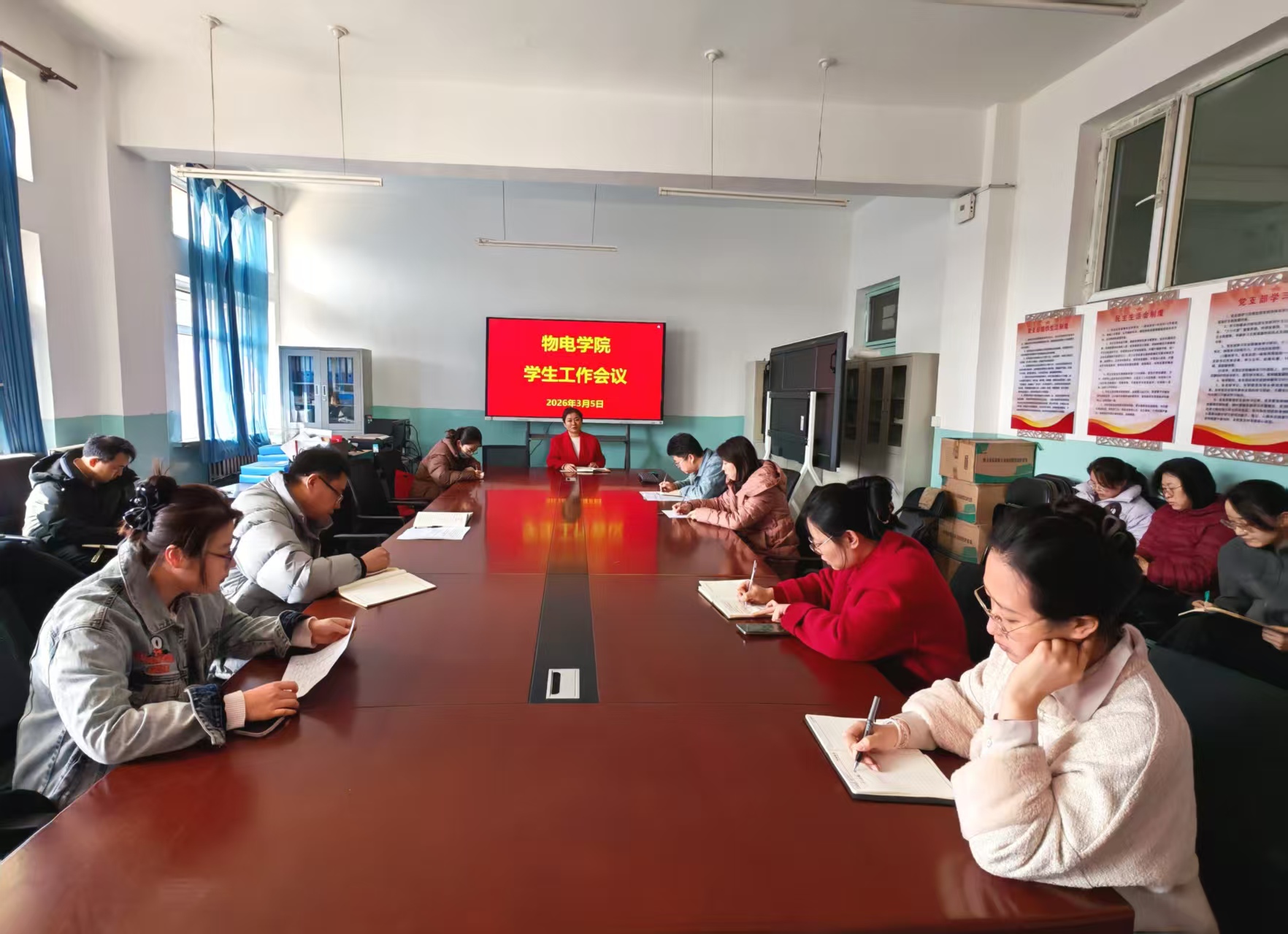 3月5日上午,物电学院在明理楼308室召开2026年春季新学期学生工作例会。全体专兼职辅导员参加会议,会议由院党委副书记吉秦雁主持。